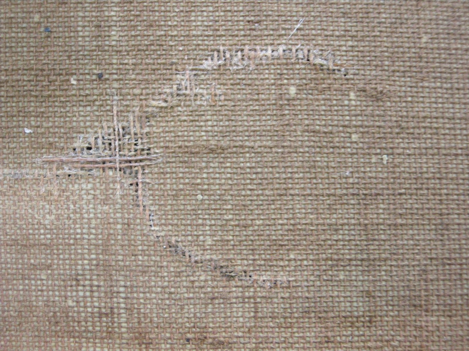 Alle scheuren zijn gehecht na uren van werken onder de microscoop. En dat is in totaal 46 cm scheur in linnen gehecht. Nu het schilderij omdraaien en naar de voorzijde om daar de afwerking te bepalen.