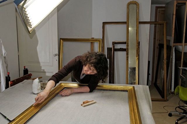 De restauratie van lijsten laten we over aan collega’s die gespecialiseerd zijn in lijsten restauratie en conservering. Hier is Josien van der Werf aan het werk in haar studio.