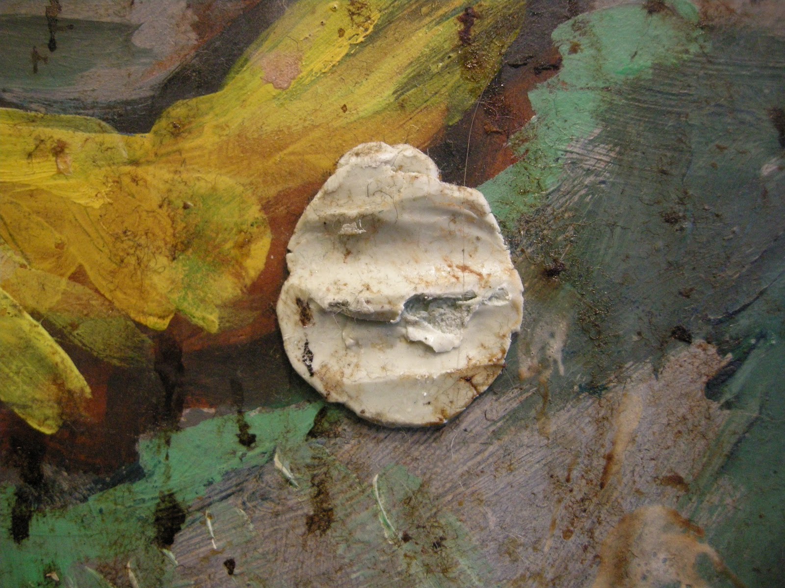 Eindelijk zag ik de muurschildering van Lucebert ‘Vrede is eten met muziek’ in het echt! Lucebert schilderde het werk voor de leerlingen van het Werkman College in Groningen in 1985. Het is speciaal voor die ene wand in de kantine gemaakt. Schilderen over eten doet eten. Het bewijs is te zien op het kunstwerk. Want overal spetters van eten en drinken en zelfs kauwgom. Hier en daar een stukje tape, redelijk wat veel krassen van tafels, afgebroken verfklodders maar geen opzettelijke verminking.Ik nam drie uur de tijd om het werk te bestuderen: maakte foto’s, bekeek het werk onder UV licht, testte het oppervlaktevuil op mogelijke reiniging, inventariseerde de schades naar soort, frequentie en lokatie, bekeek de schades en reinigingstesten onder de microscoop, en samen met het ’team G2O’ namen we de maten op en onderzochten het ophangsysteem.