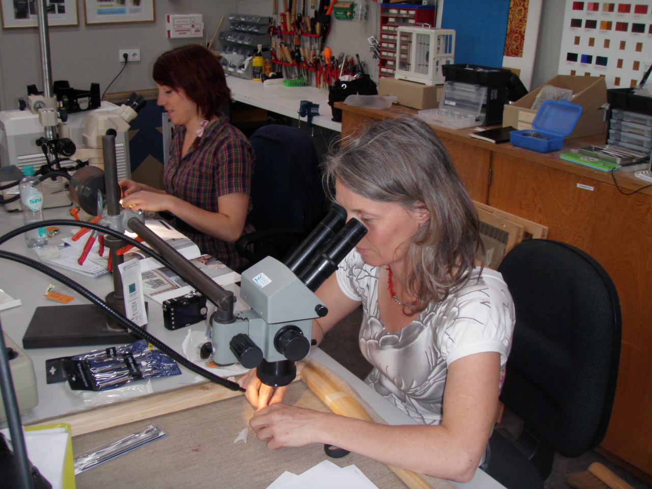 Louise Wijnberg doceert restauratoren hoe ze scheuren in het linnen moeten herstellen