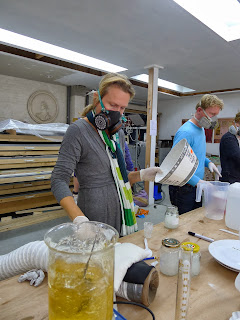 Voor collega restauratoren organiseerde ik, Marjan de Visser, samen met Zuhura Iddi (SRAL) eind september 2013 een ‘Mengdag’ om samen de Modular Cleaning Program Set te mengen. In 2 dagen mengden 14 tot 16 restauratoren uit de disciplines hout/meubel, schilderijen en historische interieurs twee ‘MCP mengdag’ sets. Een aqueous en een solvent set. De ‘MCP mengdag sets’ zijn aangepaste sets ten opzichte van de aqueous concentrated – en Solvent Gel set, want enkele surfactants zijn niet in Nederland (Europa) verkrijgbaar.